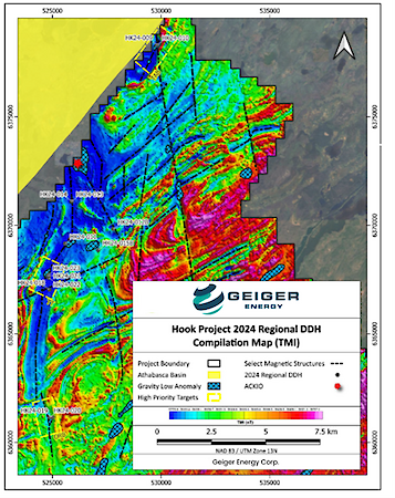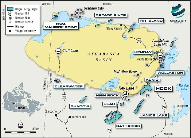 In the Athabasca Basin, Geiger is advancing its Hook Project, which hosts the ACKIO near-surface uranium prospect.
