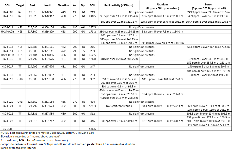 Table 1: 2024 Hook drill collar locations and radioactivity/geochemistry results (HK24-009 to HK24-023).