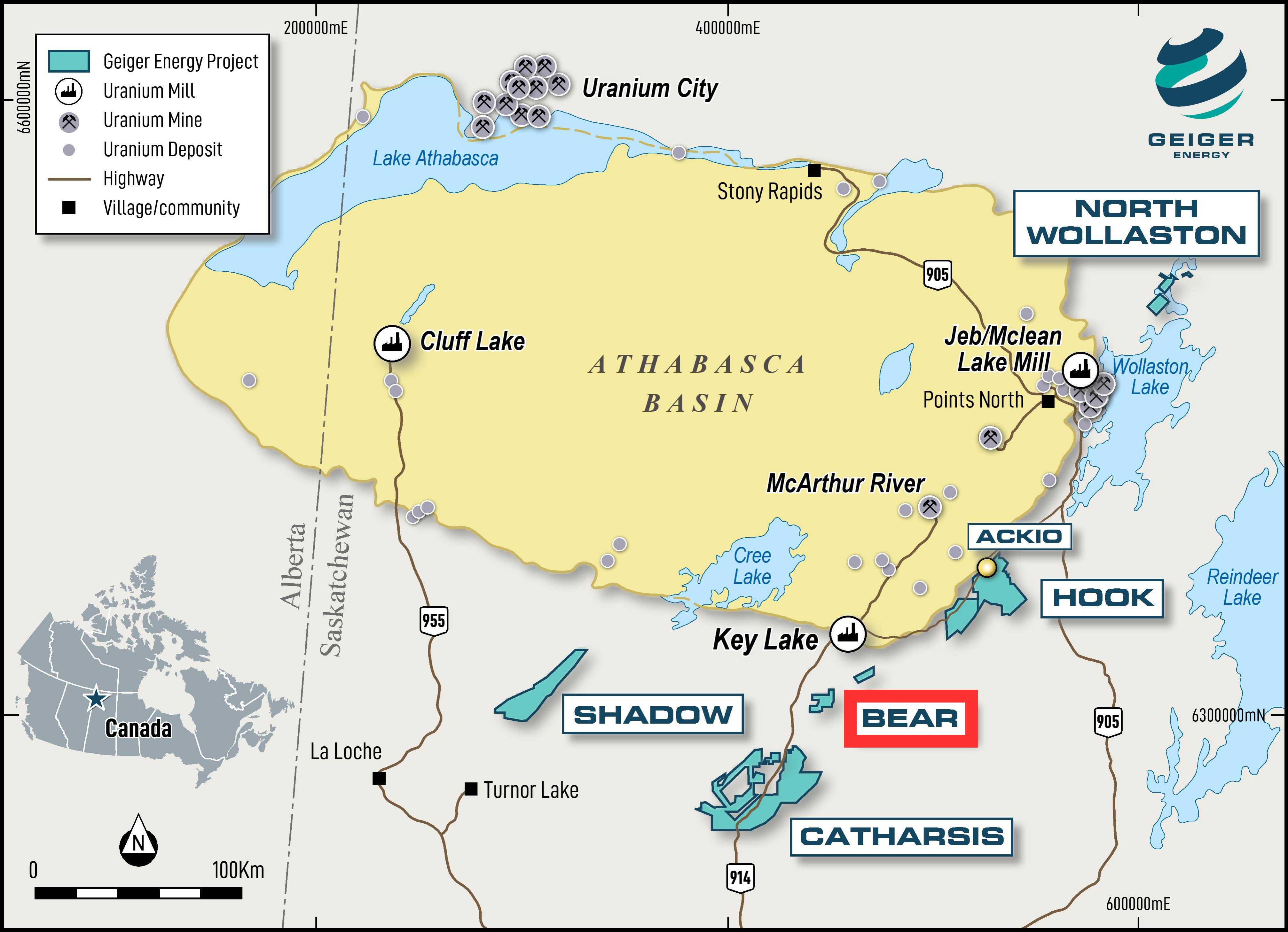 The Bear project is 100% owned by Geiger Energy with no underlying royalties. Bear, like the Catharsis project, is on geological strike with the World’s largest and most-productive high-grade uranium district, the Wollaston and Mudjatik domains. Over 2 billion lbs U3O8 have been discovered along this trend. When searching for uranium deposits, this trend is the high-grade capital of the world.
