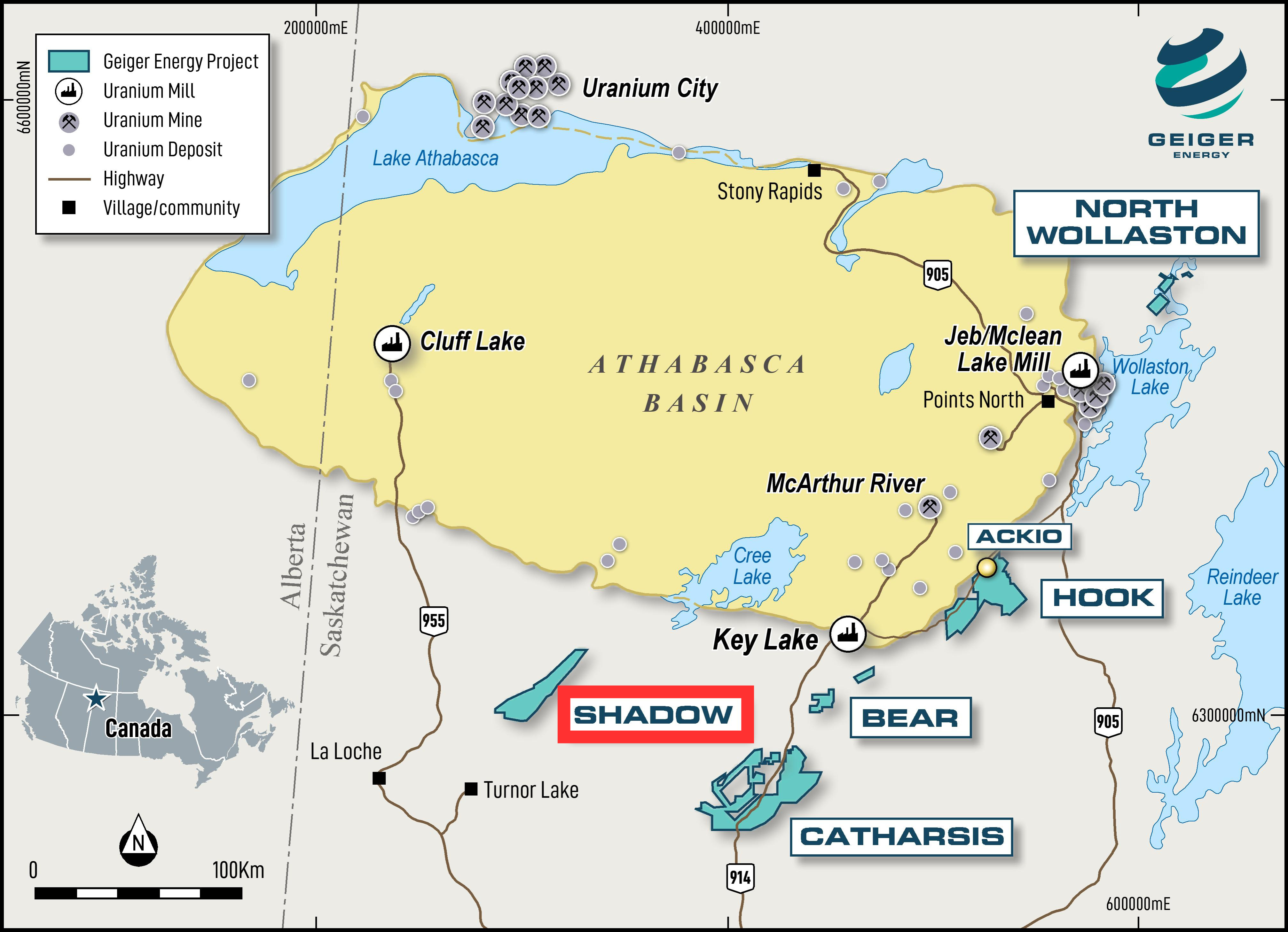 Shadow is located on one of the largest structural trends observed in Northern Saskatchewan, the Virgin River Shear Zone, which hosts other uranium deposits, most notably Cameco’s Centennial uranium deposit. The property encompasses ~30,000 hectares along the Virgin River Shear Zone 30 km south of the Athabasca Basin margin.